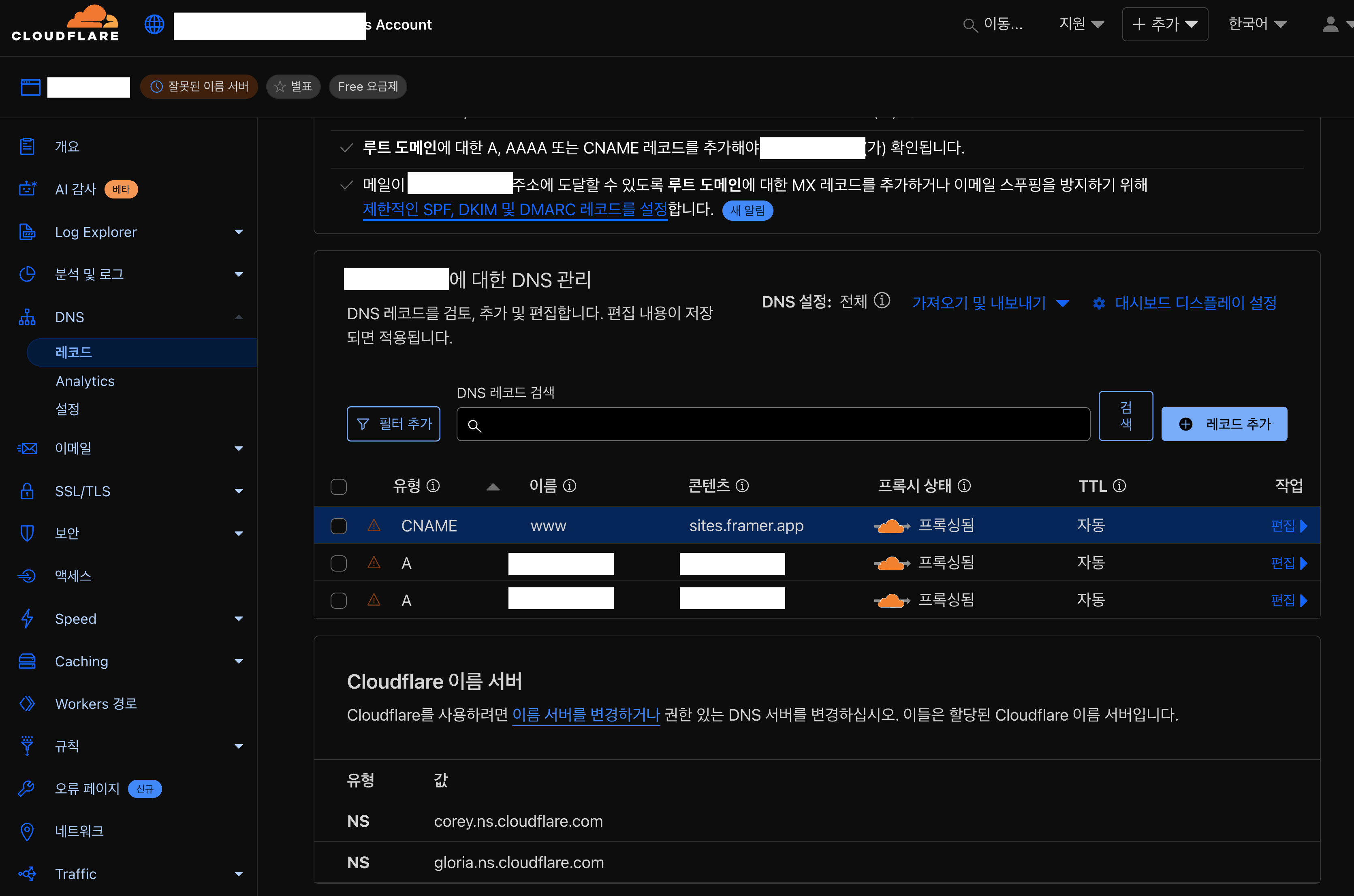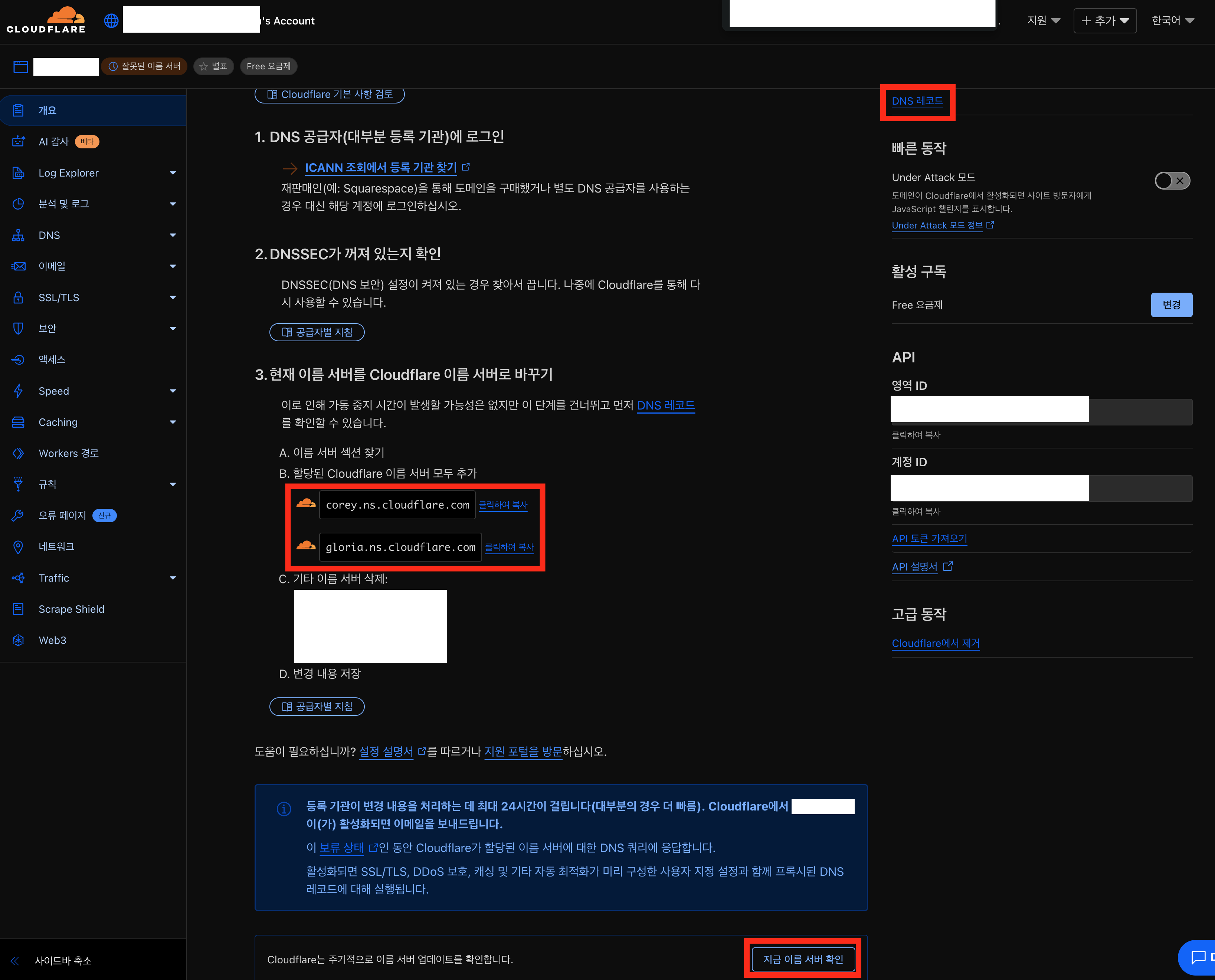 이번 튜토리얼에서는 Cloudflare의 프록시 기능을 사용하기 위해, 도메인의 네임서버를 Cloudflare로 변경하는 과정이 포함되어 있습니다. 꼭 필요한 단계이니 참고해서 진행해 주세요.