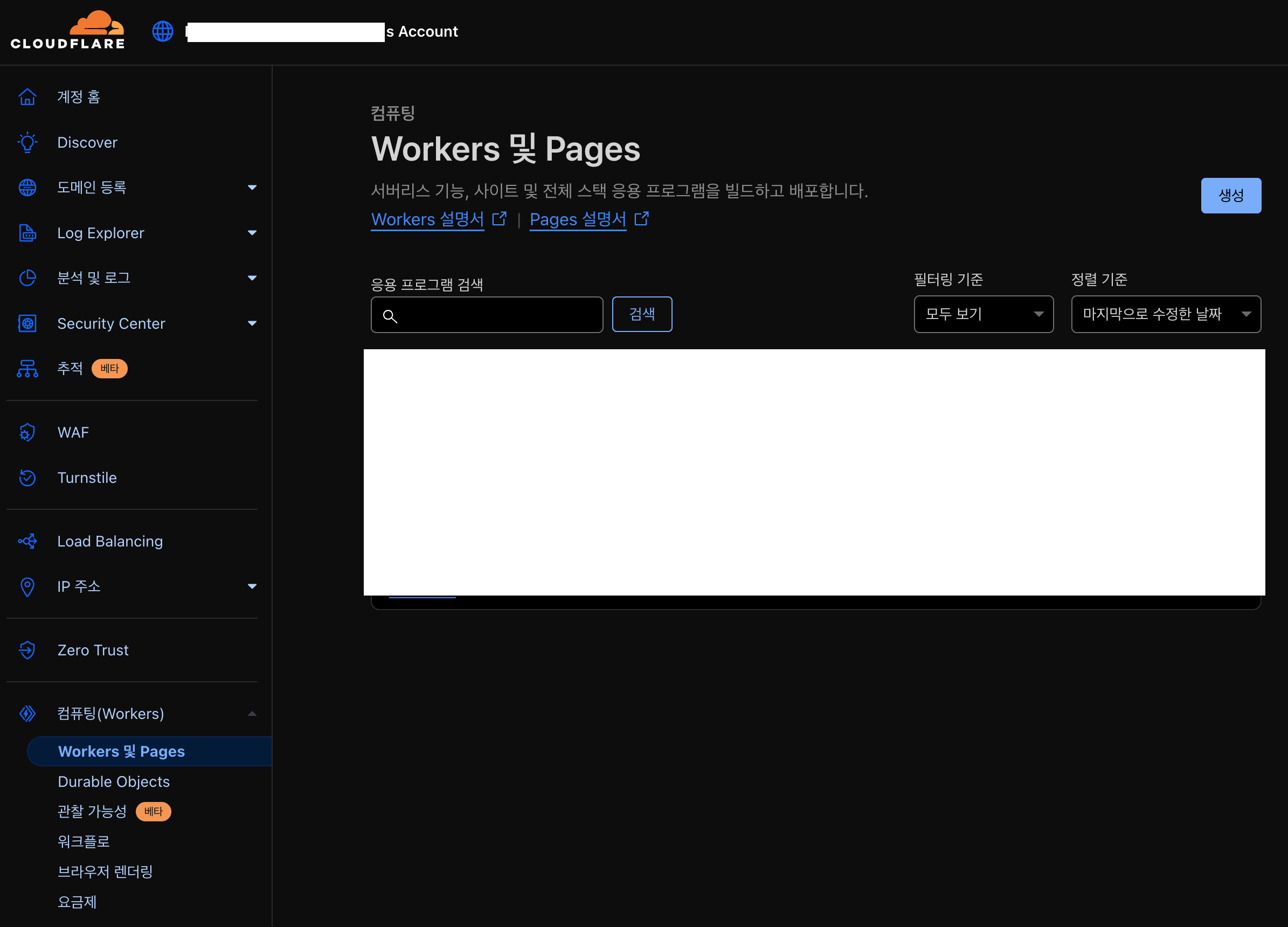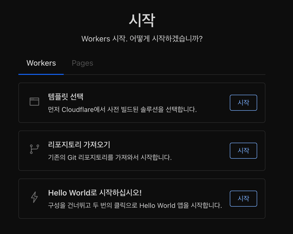 위 그림과 같이, workers 및 pages 페이지로 이동하여 생성을 눌러줍니다.