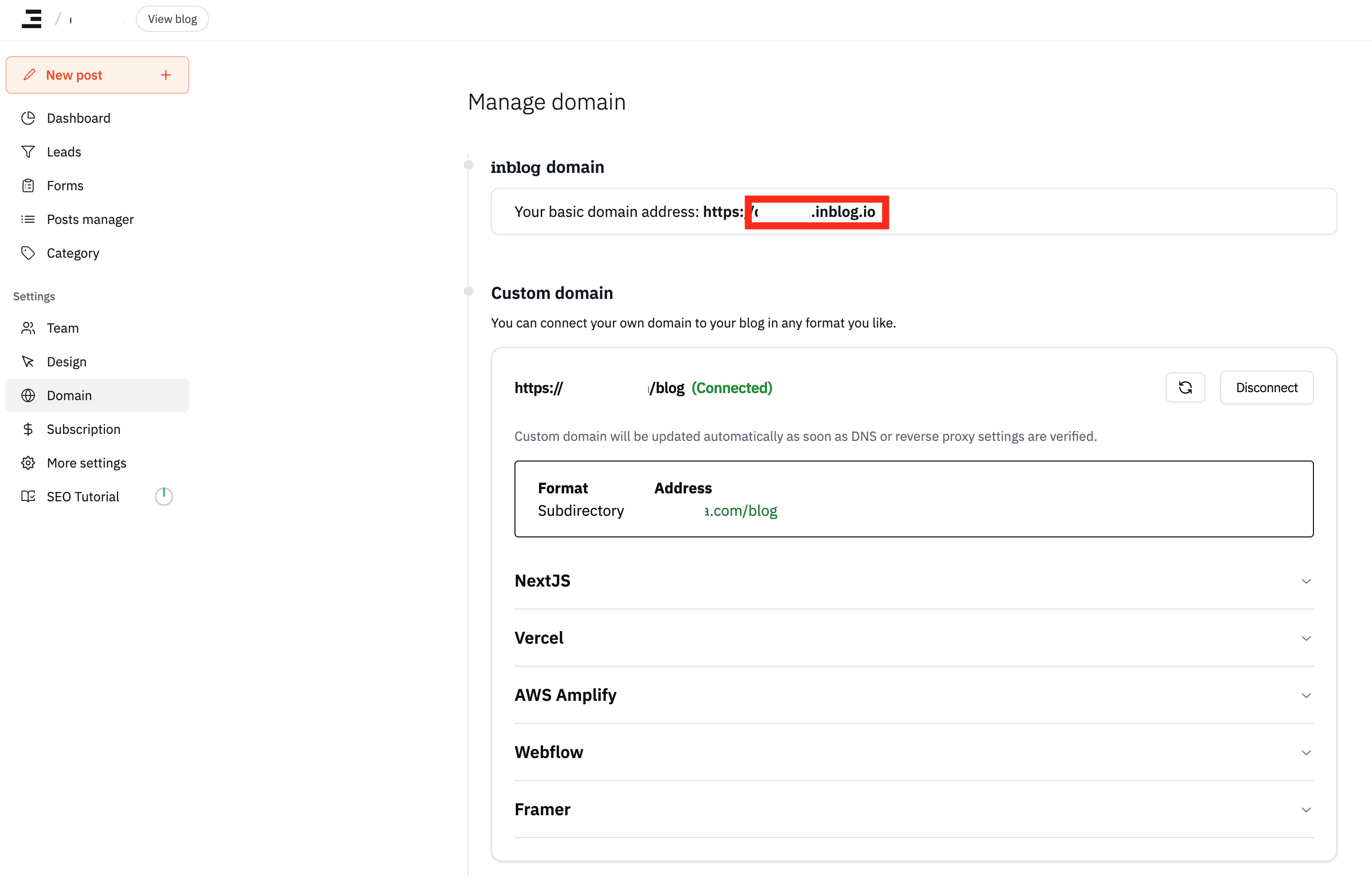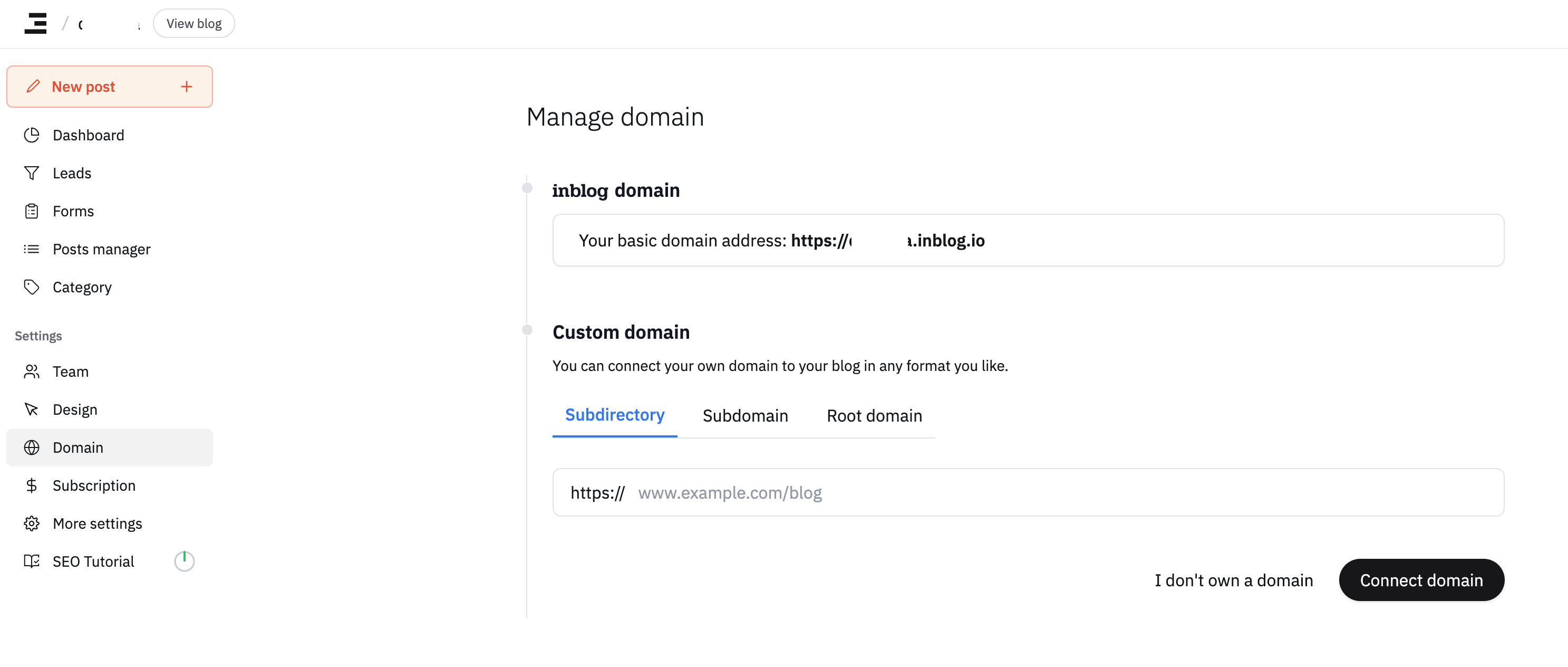 Inblog 의 도메인 설정창에서 Subdirectory 를 선택후, 자신의 도메인을 적습니다. (예: example.com/blog)