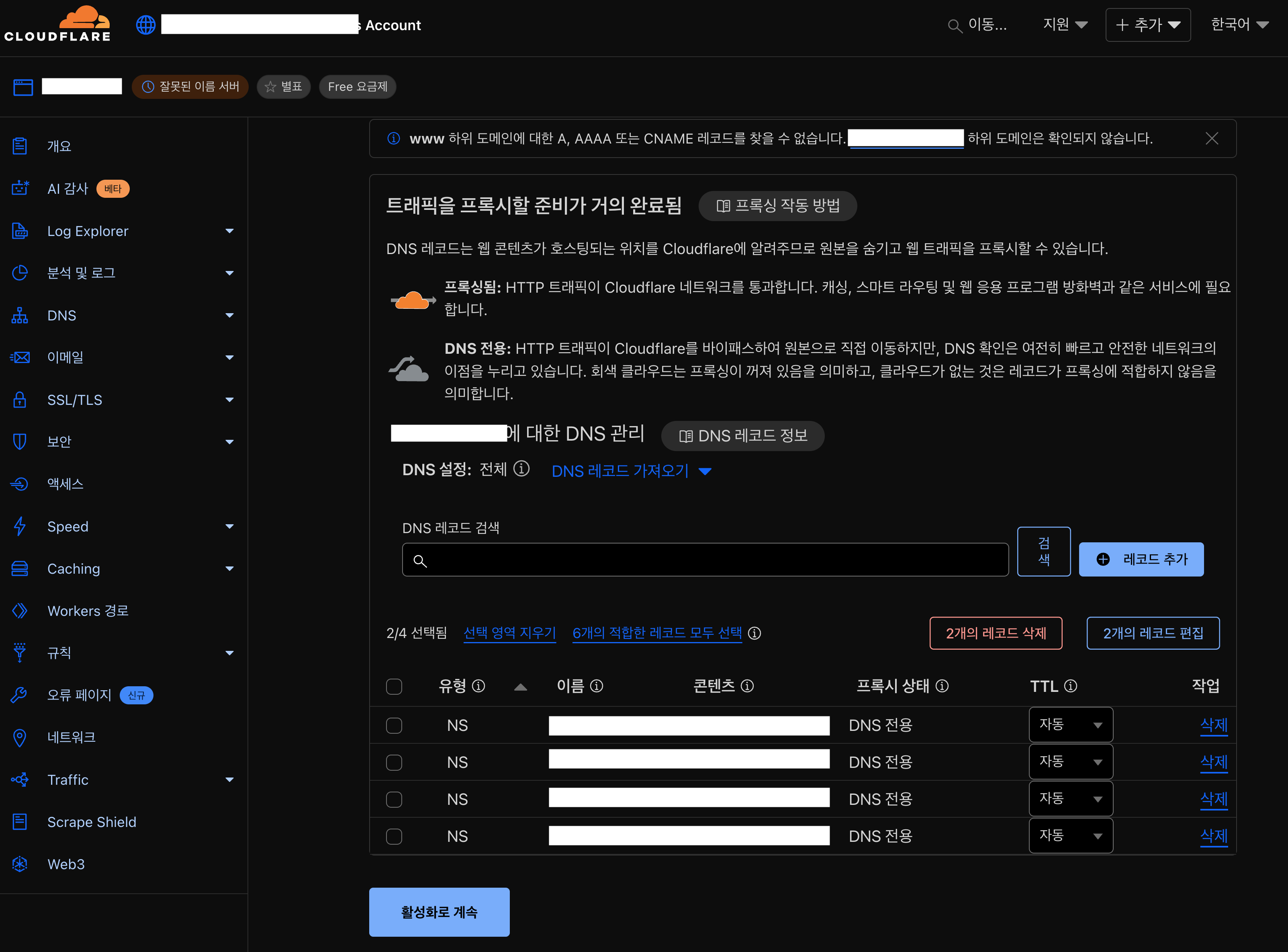 위와 같은 창이 뜰텐데, 이는 기존에 사용하던 dns 레코드가 자동으로 넘어온 것으로 이상이 있는지 체크 합니다. (유형이 NS 인 레코드는 기존 네임서버와 연결하던 레코드로 삭제하셔도 무방합니다)