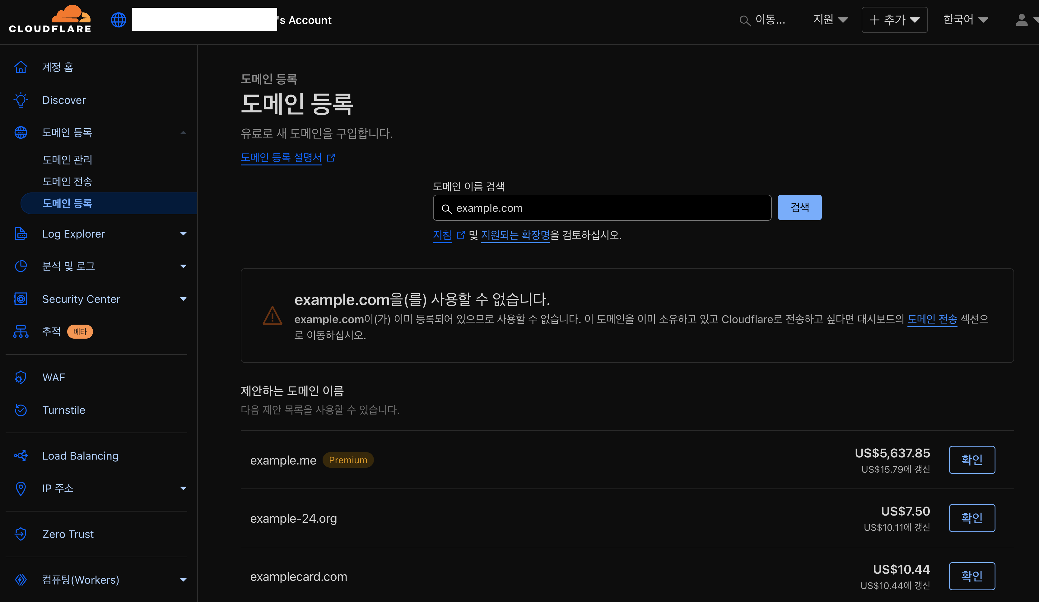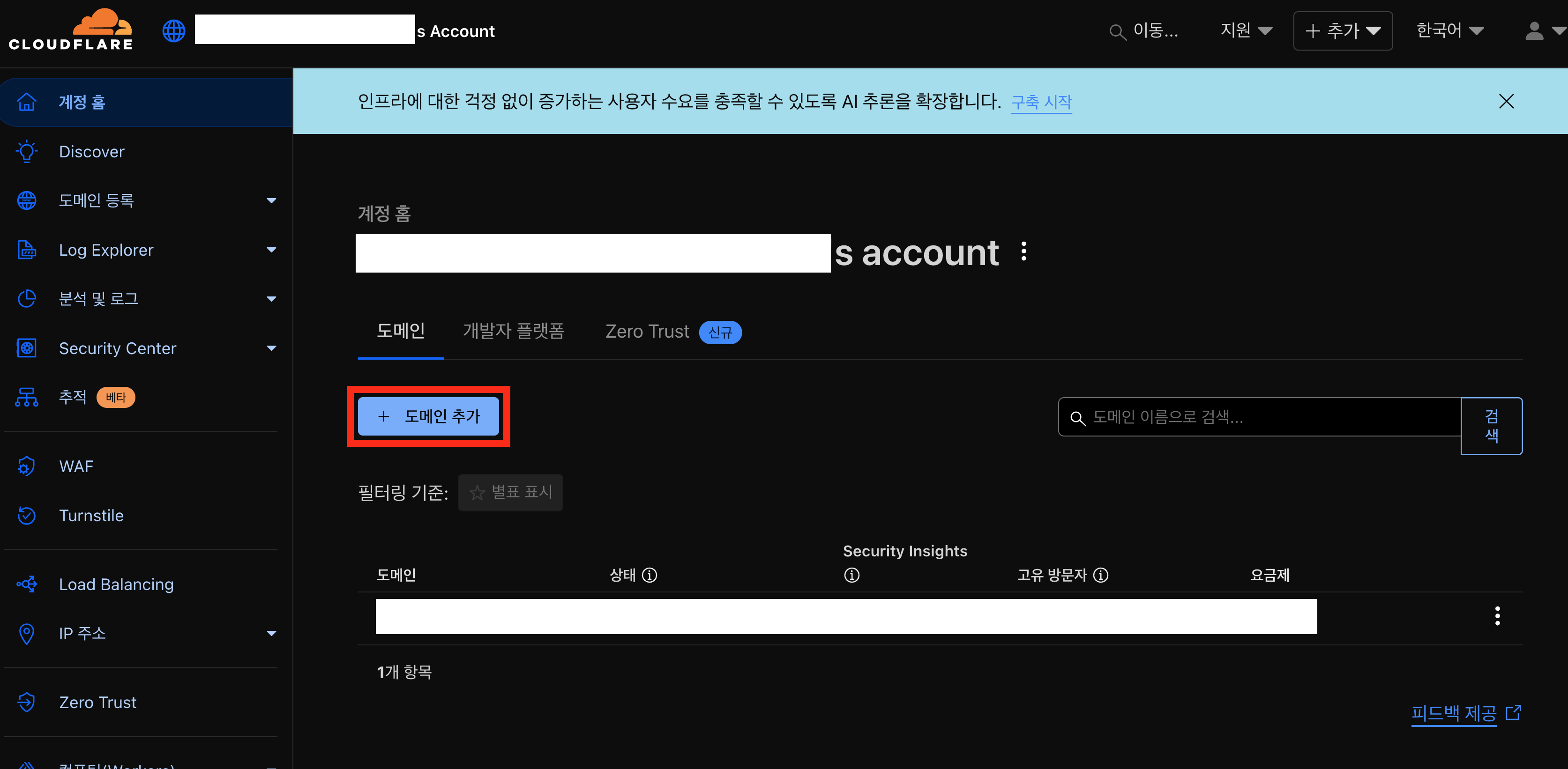 위의 과정을 잘 따라오셨다면, 위와 같은 화면을 볼 수 있습니다. (Cloudflare 콘솔 홈 화면에서 해당 도메인을 눌러 접속 가능한 화면입니다.)