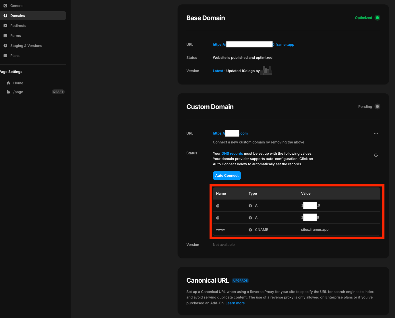 - Framer 의 custom domain 은 proxy 연결을 지원하지 않는다.