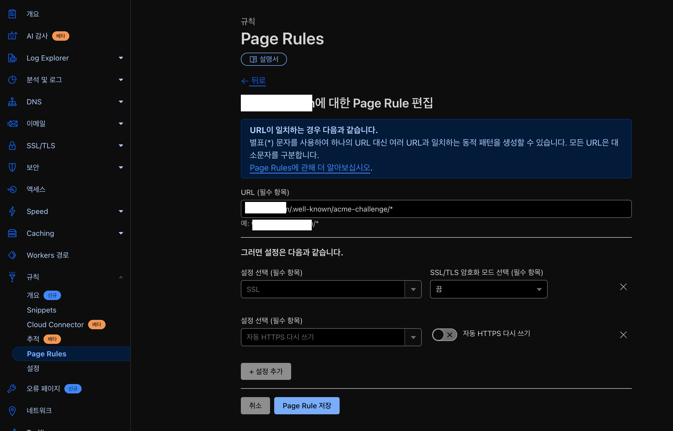 page rules 탭에서 위의 그림과 같이 URL 에 example.com/.well-known/acme-challenge/* (example.com 을 자신의 도메인으로 변경) 후, ssl 암호화 제외, 자동 HTTPS 다시 쓰기 제외로 설정해주고 저장합니다.
