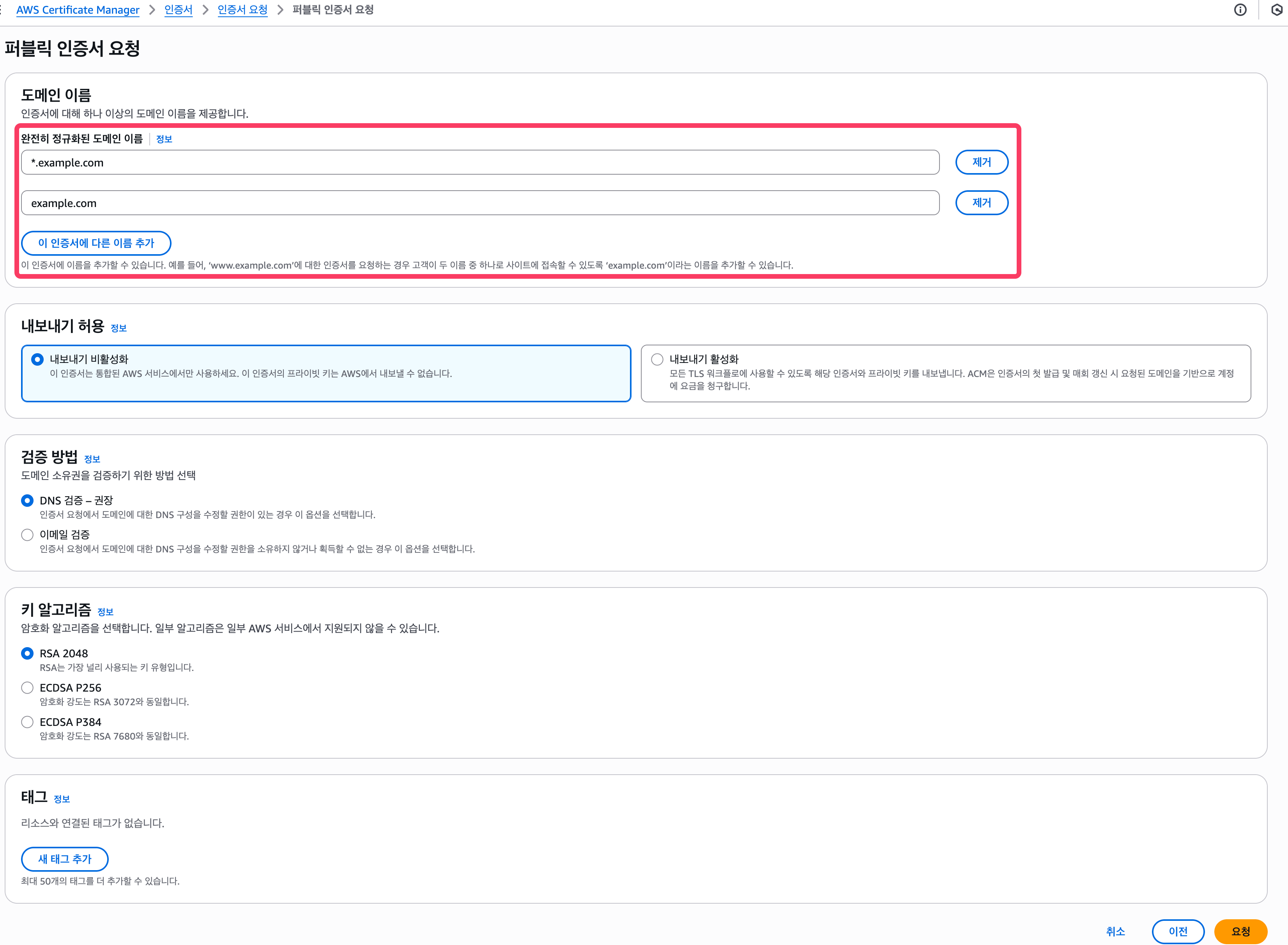 인증서 요청 -> 퍼블릭 인증서 요청을 차례로 누르며 넘어가 줍니다.