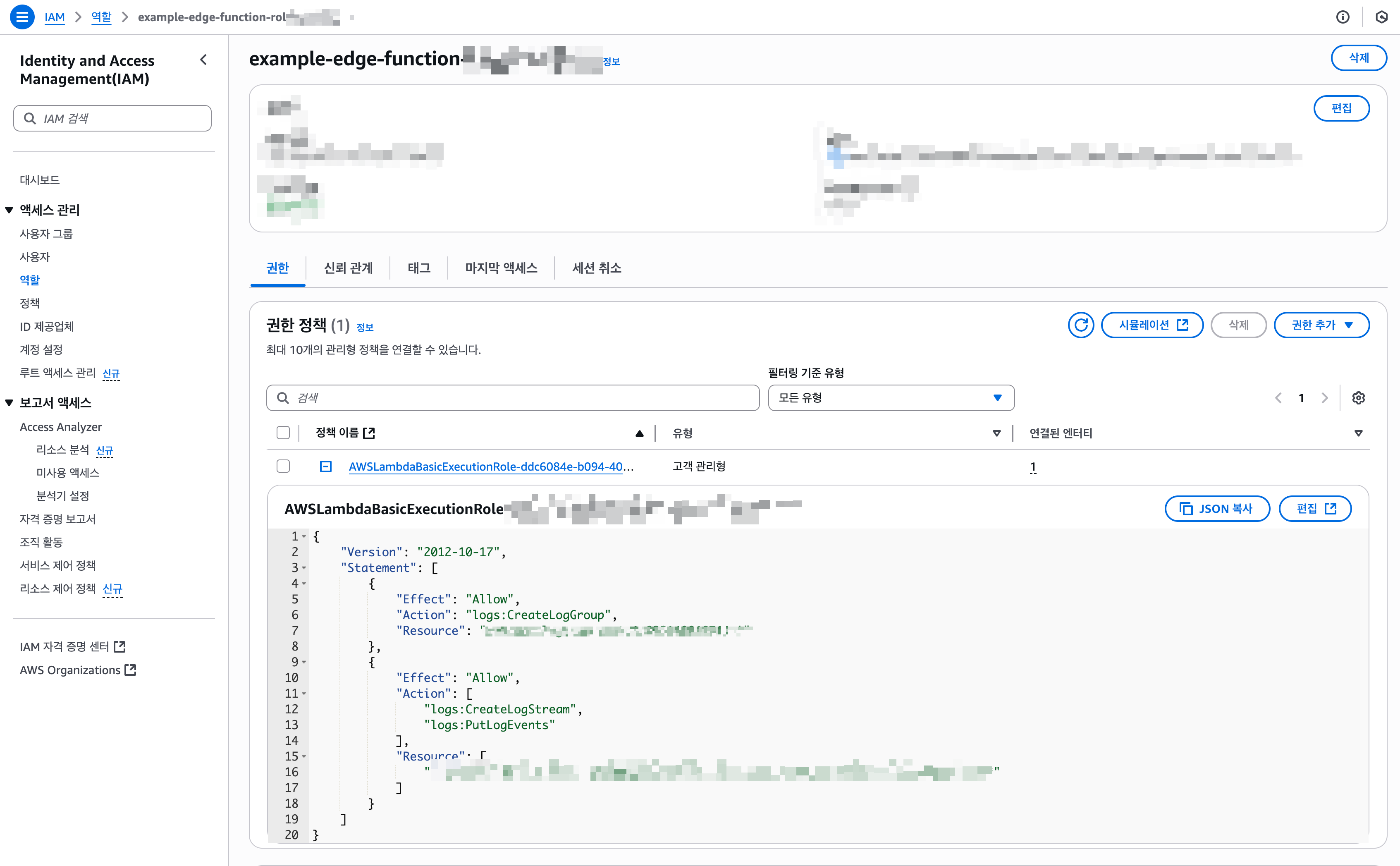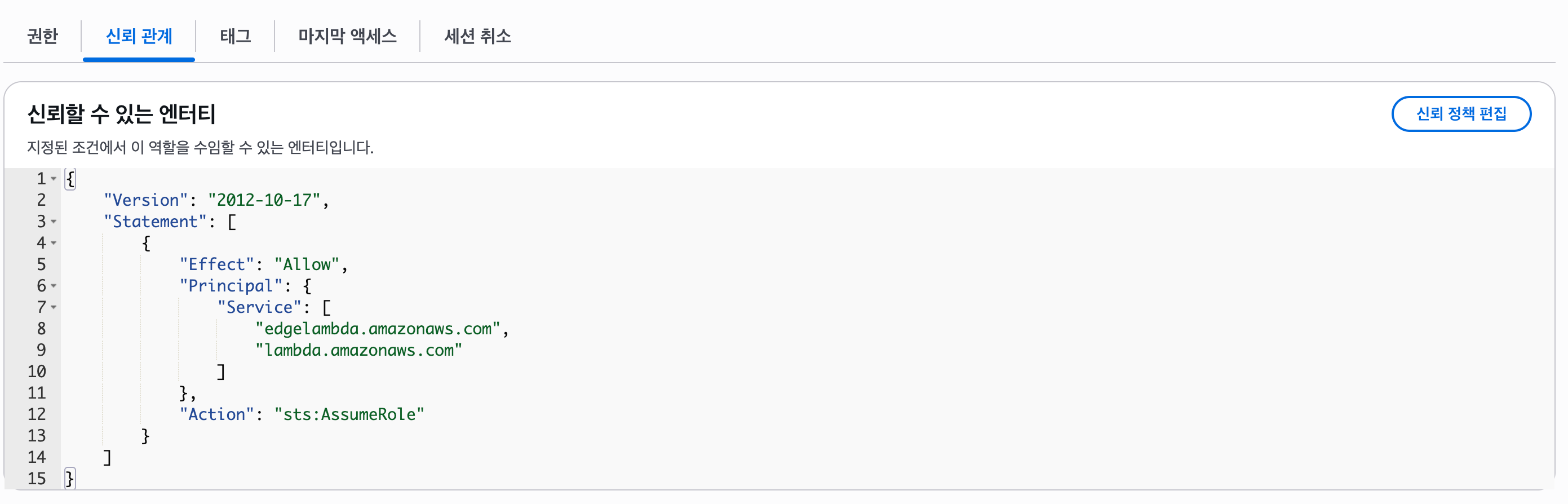 다시 Iam 에서 우리가 생성한 Lambda@Edge 의 역할탭으로 넘어가줍니다.