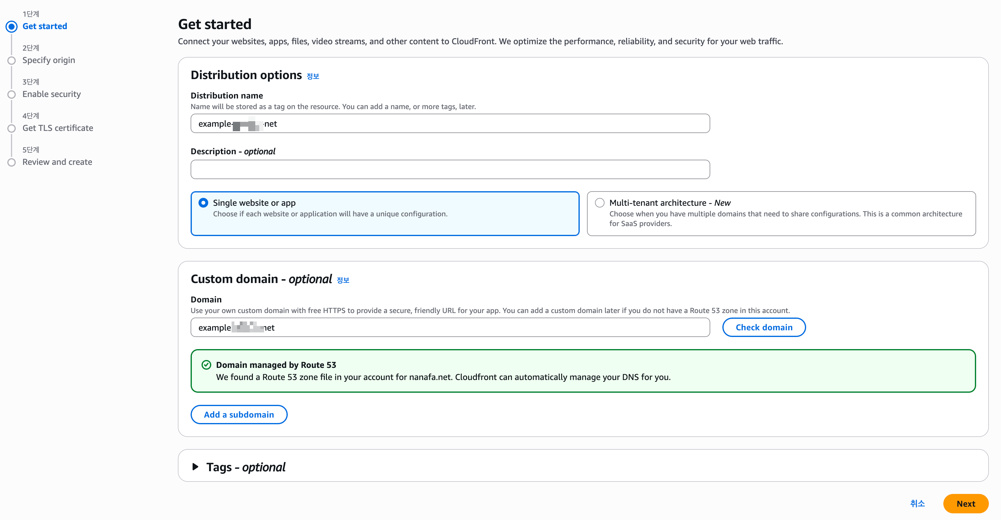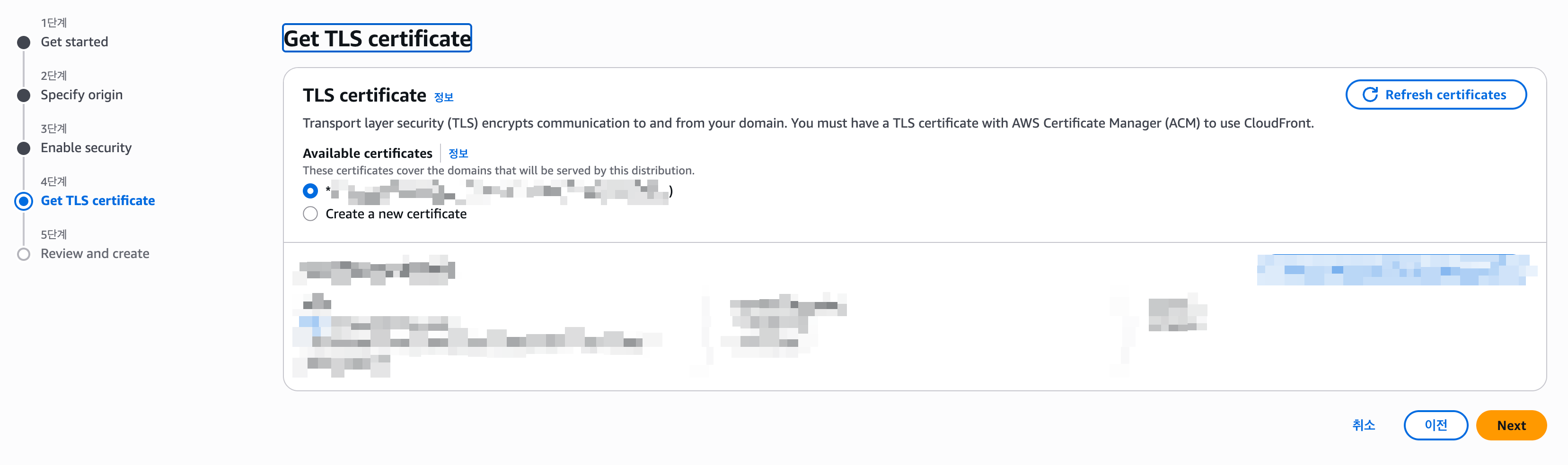 좀전 단계에서 인증서가 잘 생성되었다면, 여기에서 확인 가능 할 것입니다. 혹시 인증서가 잘 생성되었는데 이곳에 뜨지 않는다면, 인증서를 us-east-1 에 생성한것이 맞는지, 인증서와는 엉뚱한 Domain 을 설정한것이 아닌지를 확인해줍니다.