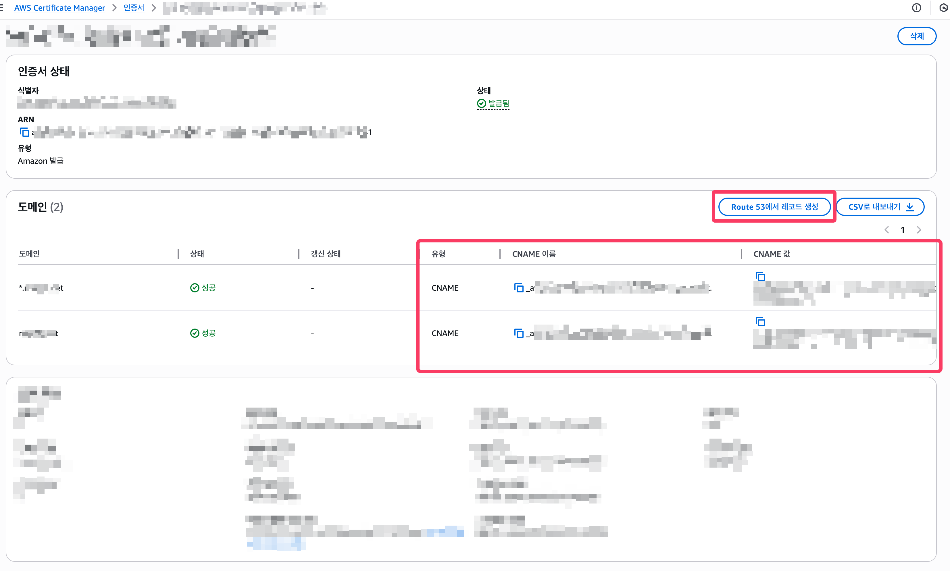 여기서 route53 으로 도메인 관리를 하시는 분은 Route53 에서 레코드 생성을 누르면 자동으로 인증받기 위한 값들이 생성되고, 다른 곳에서 도메인을 관리하시는 분은 CNAME 유형으로 레코드 이름, 값을 복사하셔서 생성하시면 됩니다.