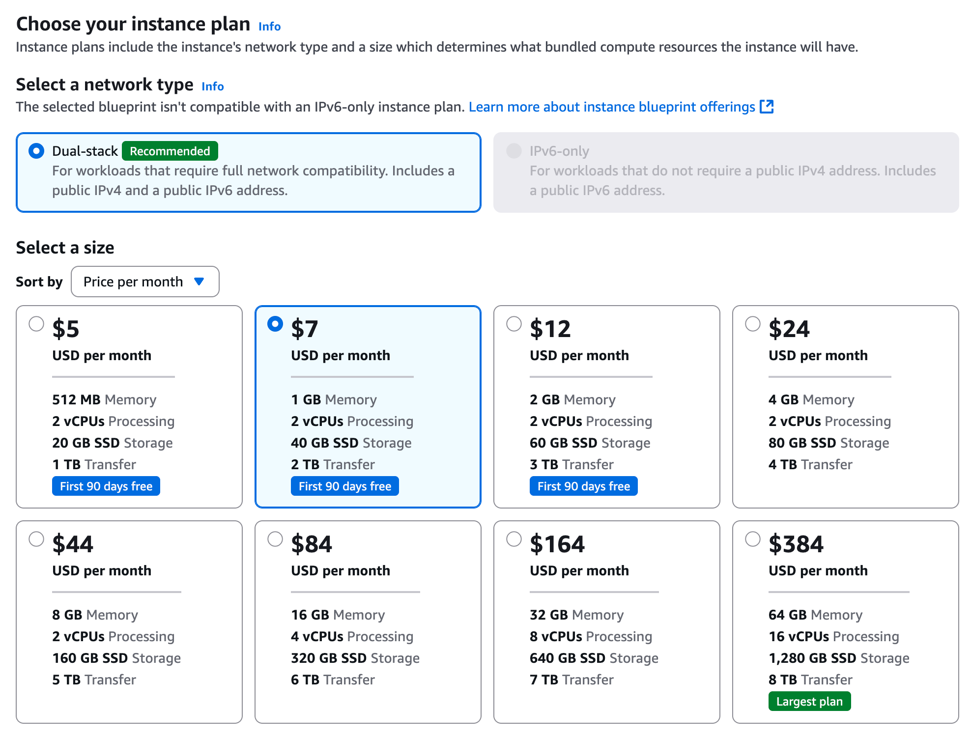 워드프레스는 월 7달러 짜리면 충분함으로, 기본 설정되어있는 7달러로 놓고 create instance 버튼을 눌러줍니다.