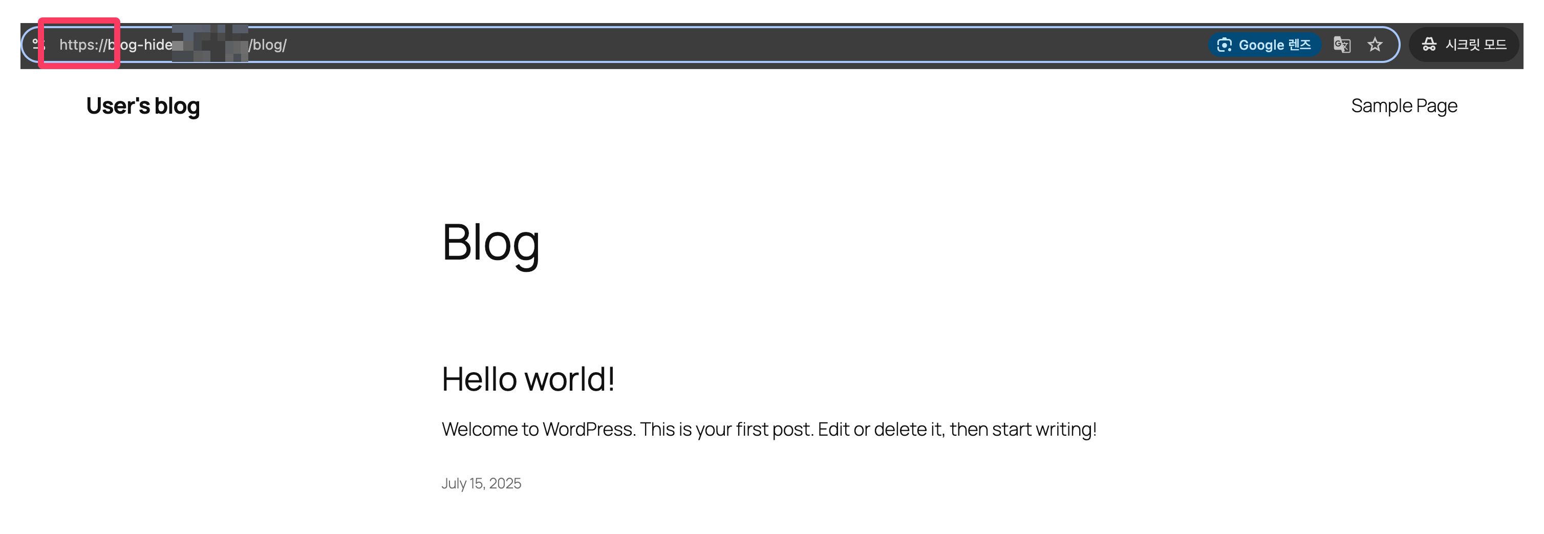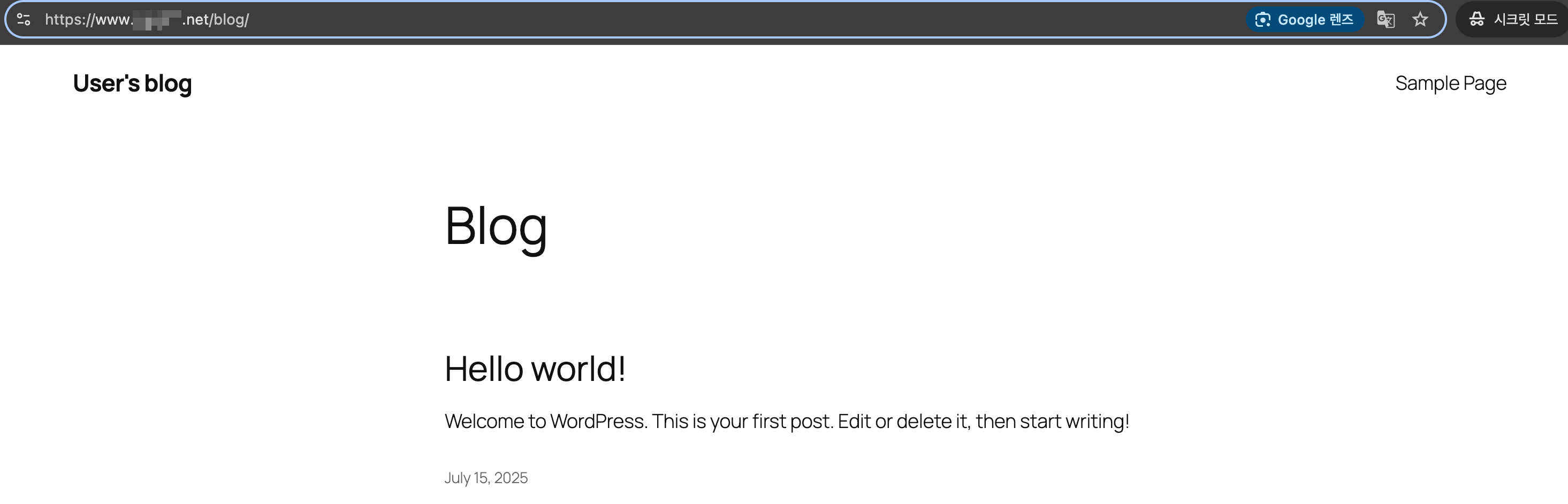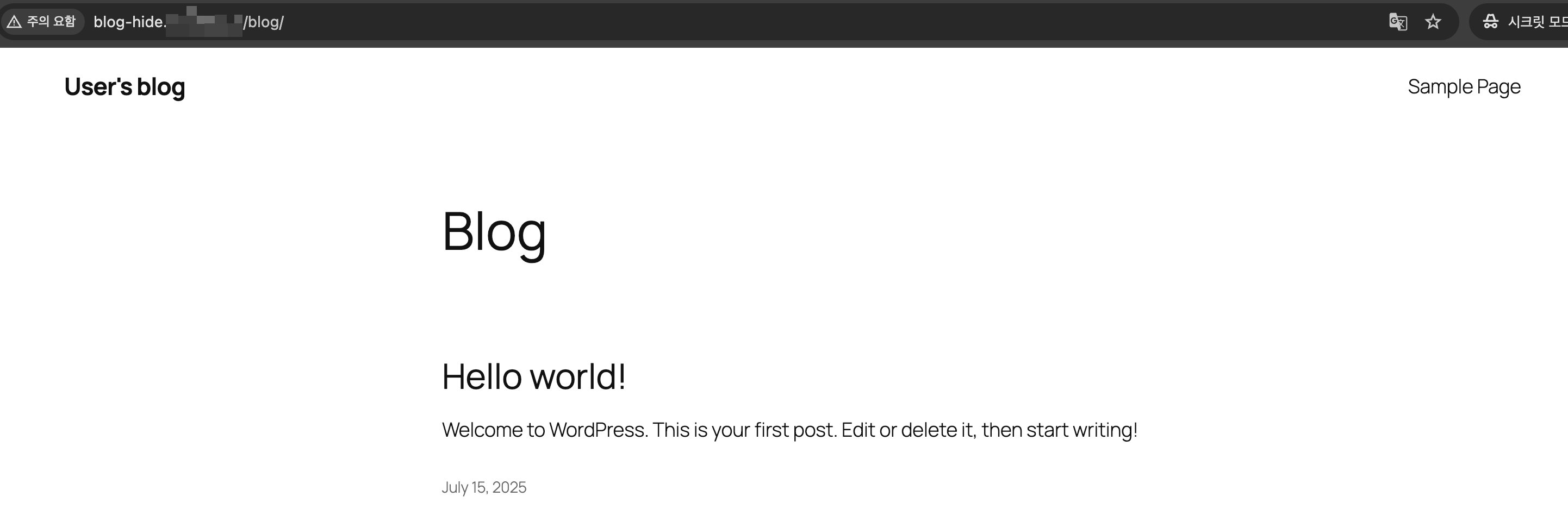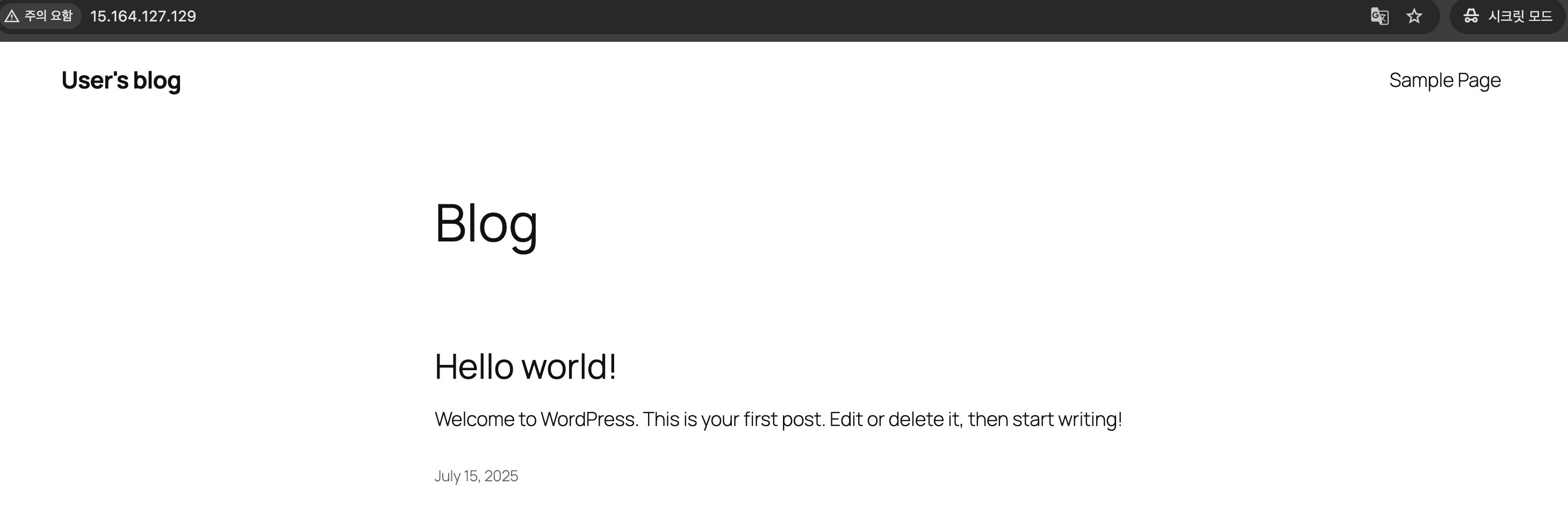 이후, http://[워드프레스 고정 ip]/blog 로 접속해보면, 메인페이지와 관리자 페이지가 /blog 로 접속가능한것을 확인할 수 있습니다.