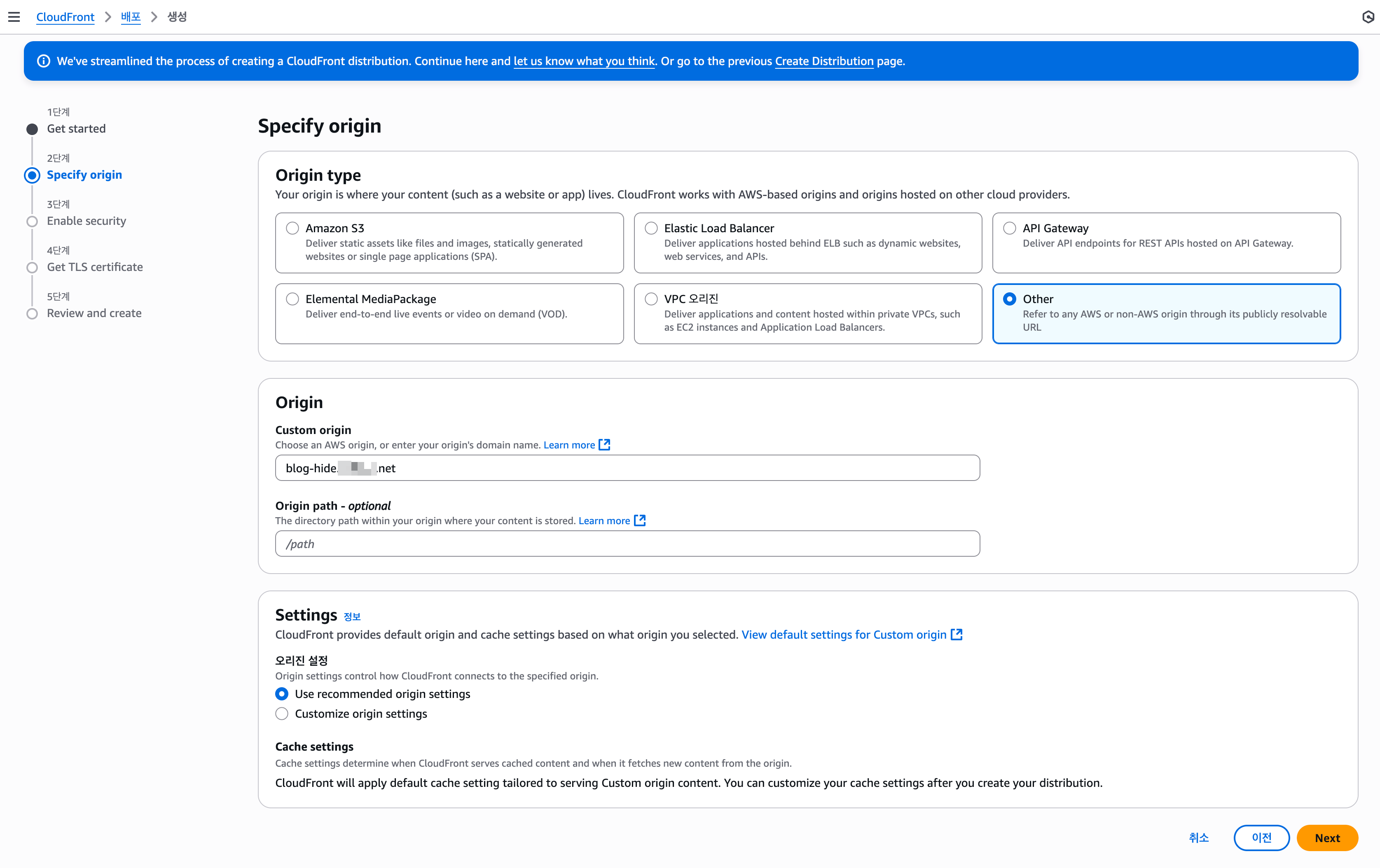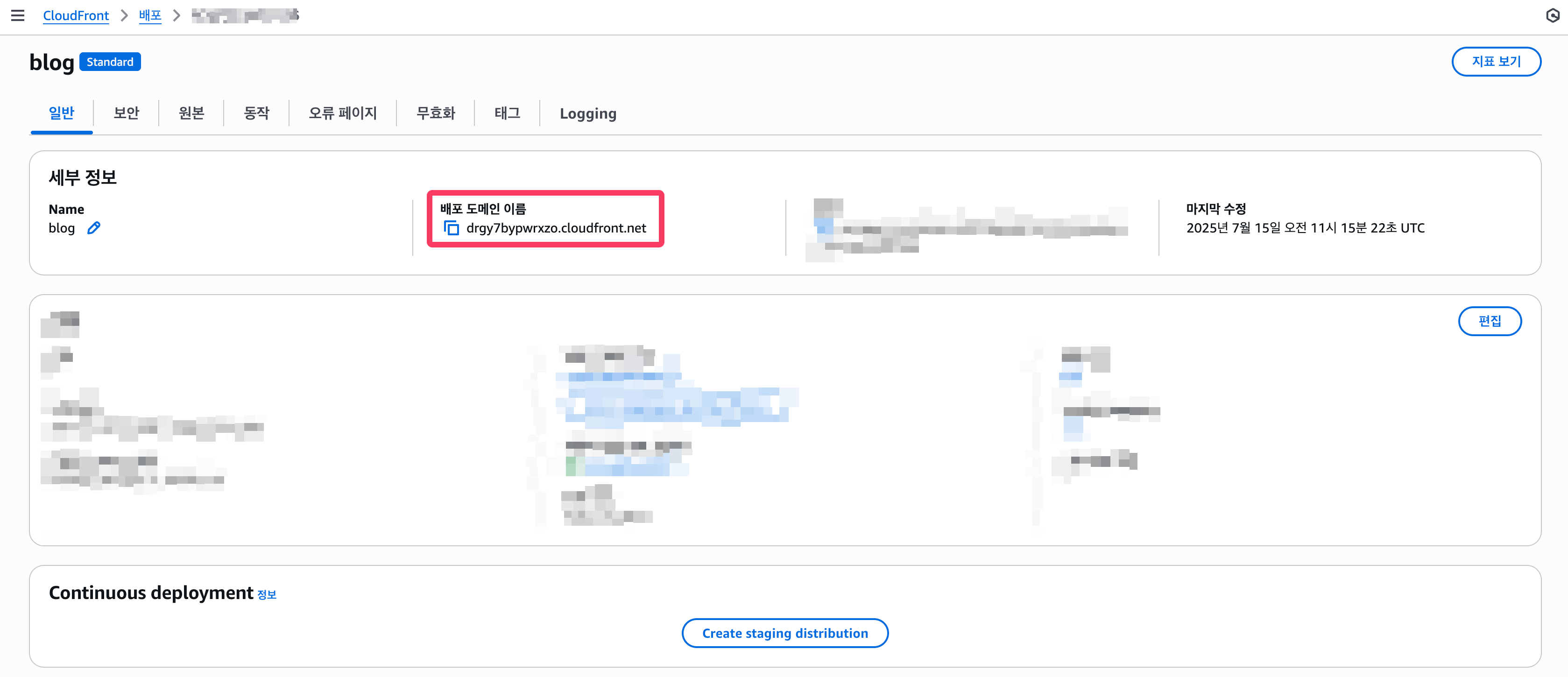 위 과정을 수행후, AWS Cloudfront 로 넘어가 배포를 생성해줍니다.