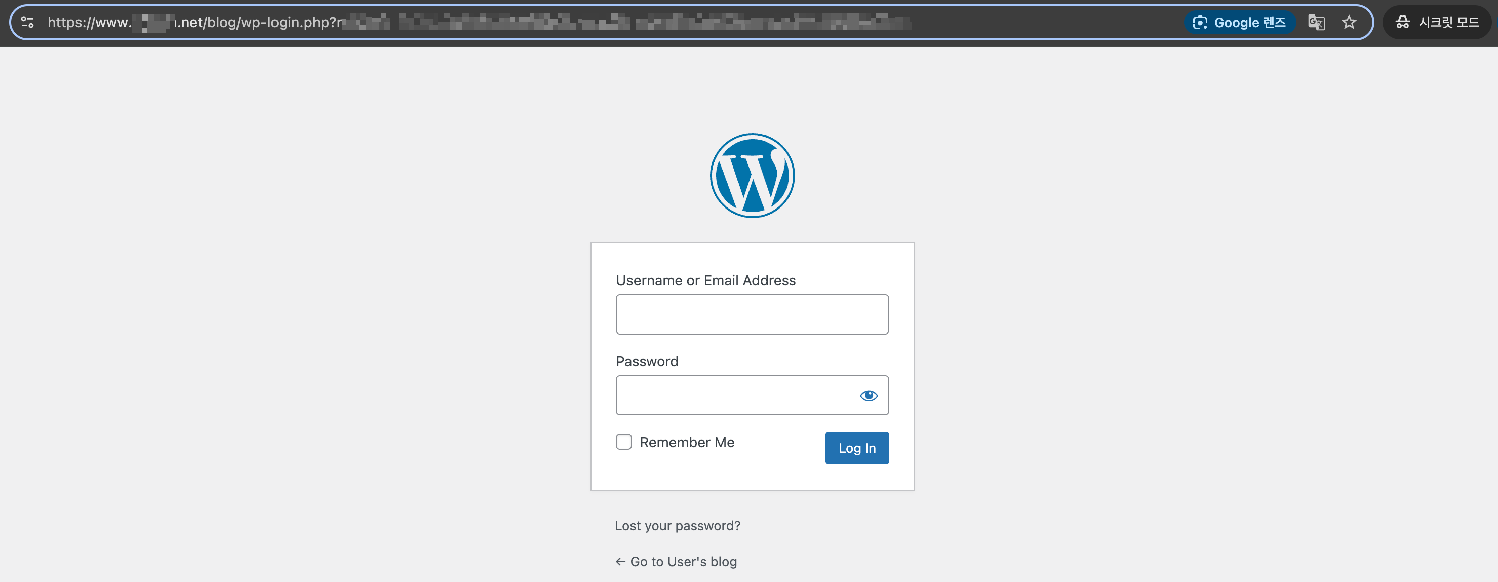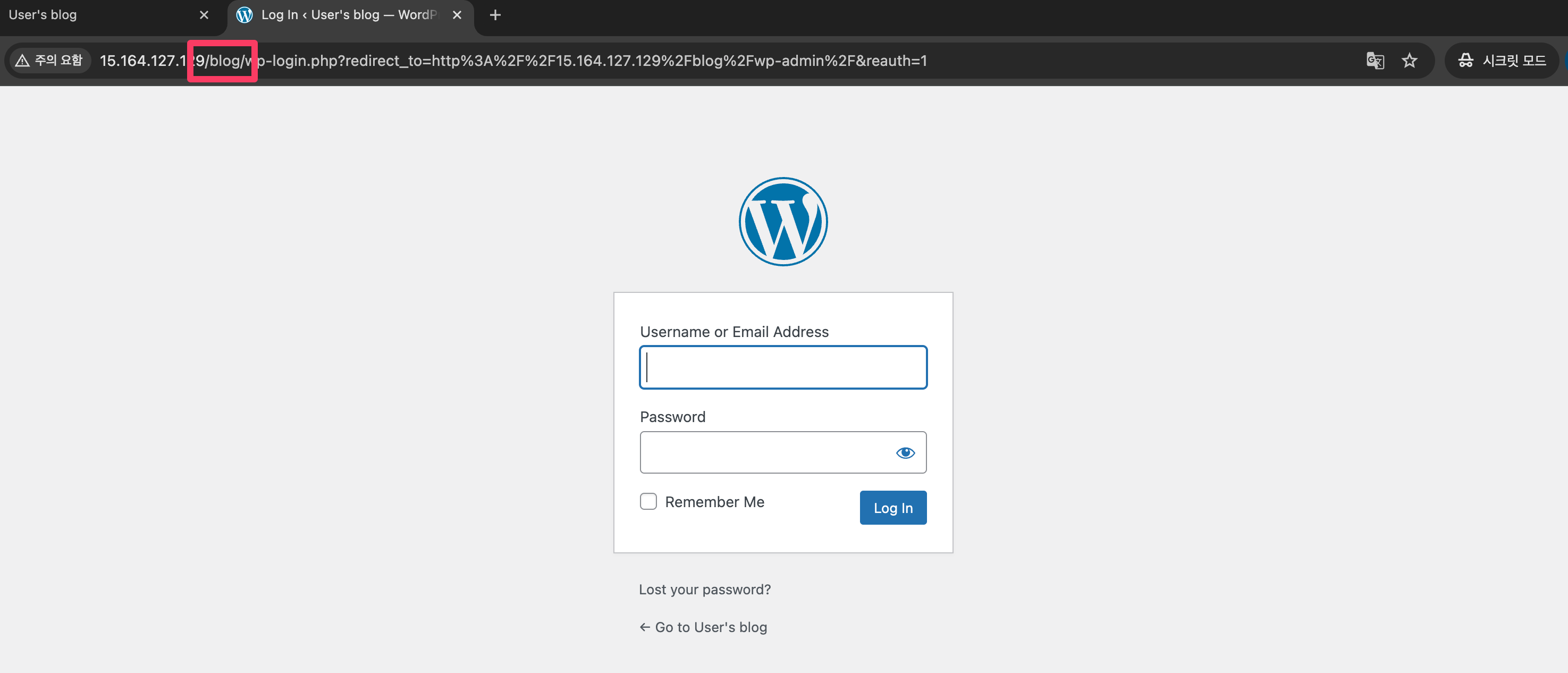 (이때, http://[워드프레스 고정 ip]/wp-admin 으로 접속시, redirect 값이 /blog/wp-admin 으로 생성되지 않아 로그인 되지 않는 이슈가 있습니다. 꼭 /blog/wp-admin 으로 접속해주세요.)