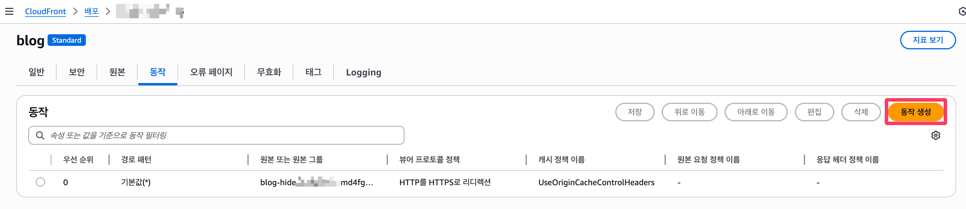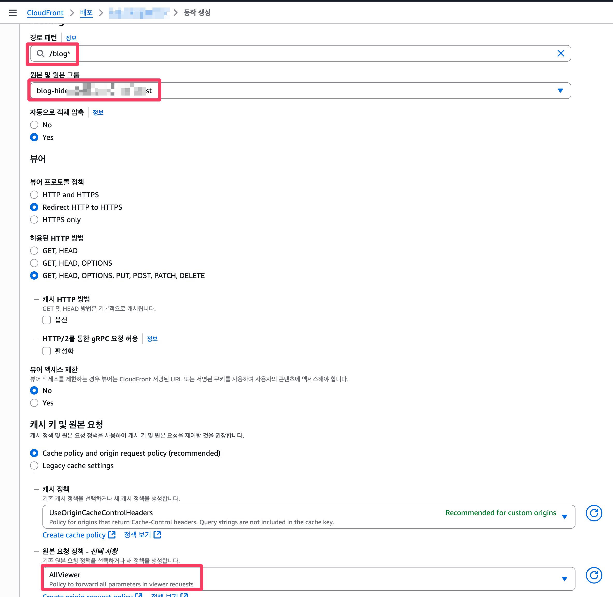 위와같이 경로를 지정해주고, 오리진을 설정해준후, 오리진 정책을 AllViewer로 변경해준후 생성을 눌러줍니다.