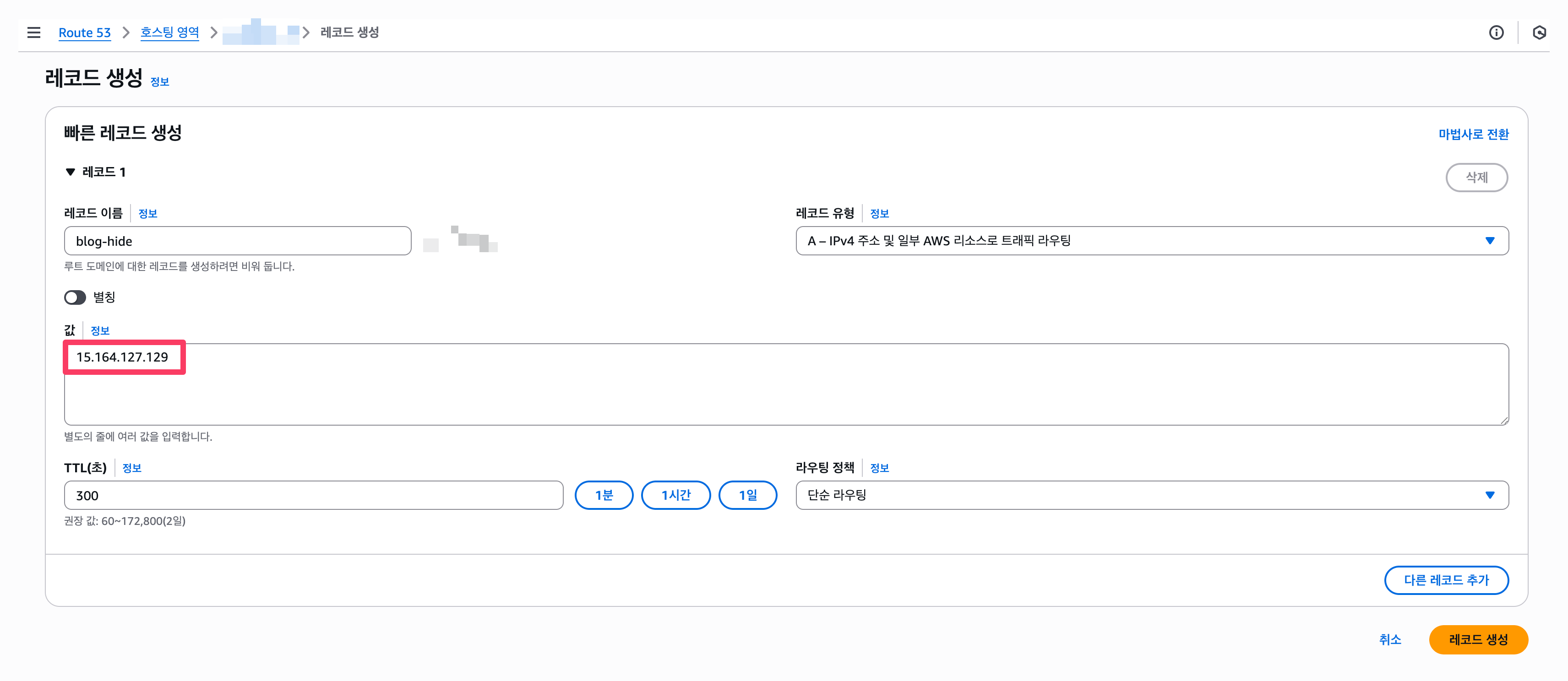 route53(각자의 네임서버) 에서 워드프레스 고정 ip 주소를 가리키는 레코드를 생성합니다.