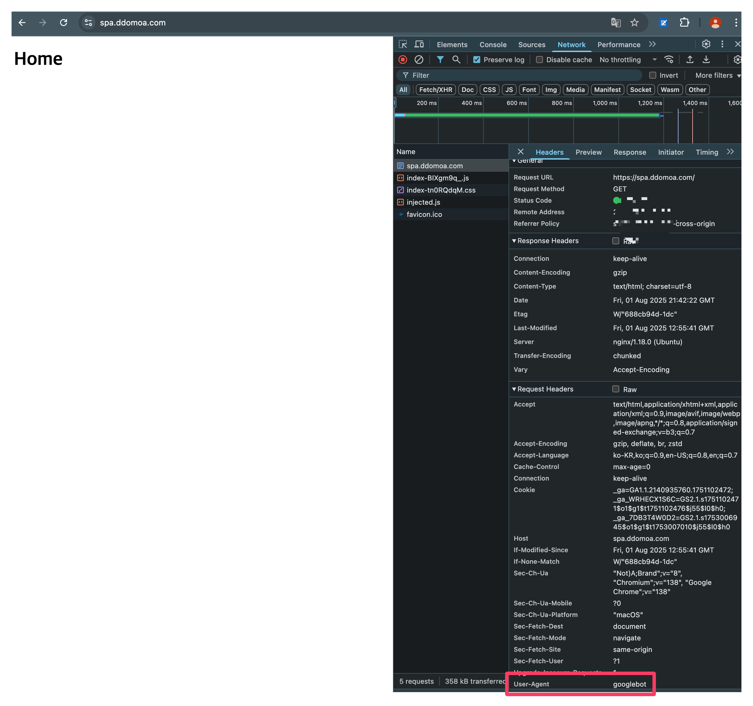 위의 그림과 같이 User-Agent 를 googlebot 으로 변경후 접속한 경우, 응답받는 html 에 우리가 동적으로 설정한 meta 태그나 렌더링된 콘텐츠가 존재하는것을 확인할 수 있습니다.