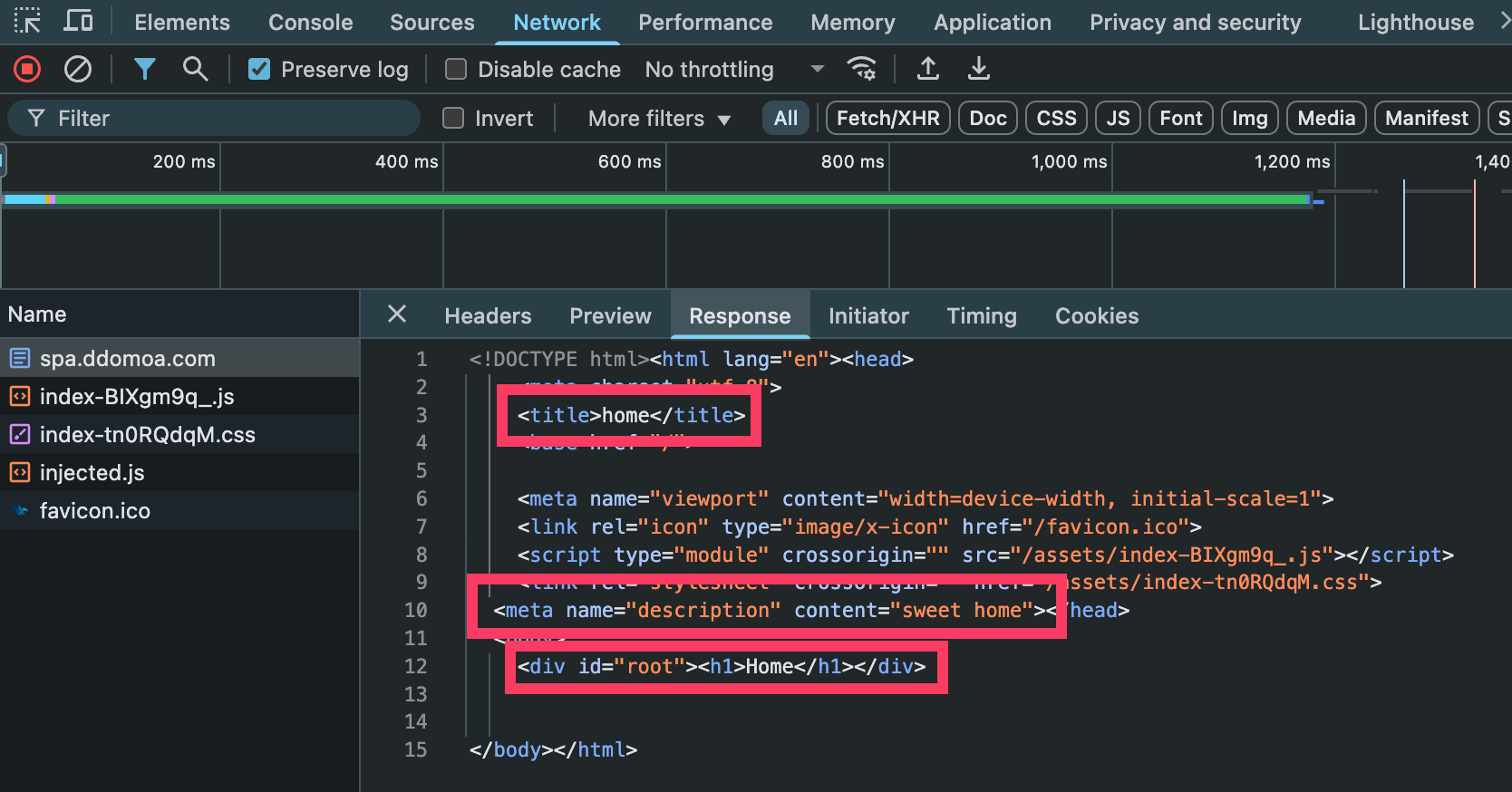위의 그림에서 확인할 수 있듯이, SPA는 우리가 동적으로 설정한 meta 태그나 렌더링된 콘텐츠를 무시하고, 기본적인 HTML 구조만을 반환하는 모습을 보여줍니다.