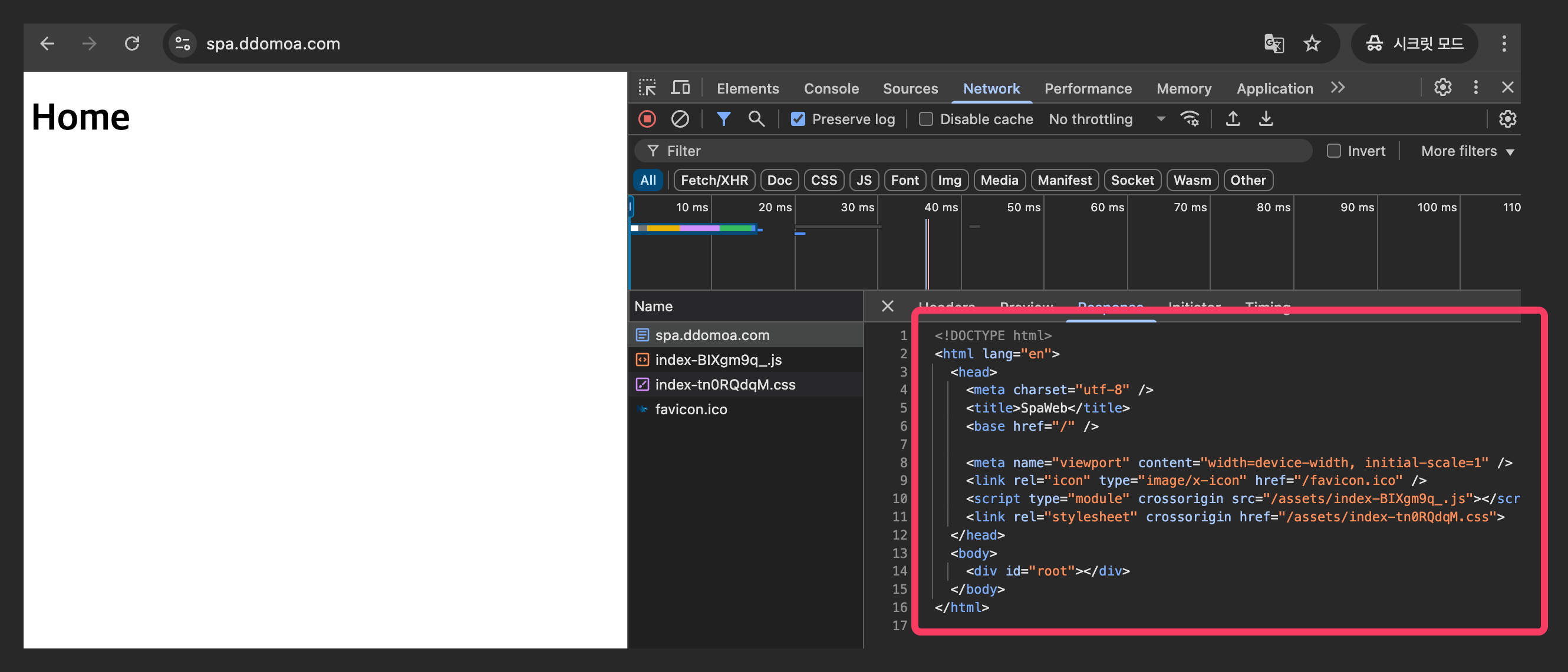 위의 그림에서 확인할 수 있듯이, SPA는 우리가 동적으로 설정한 meta 태그나 렌더링된 콘텐츠를 무시하고, 기본적인 HTML 구조만을 반환하는 모습을 보여줍니다.